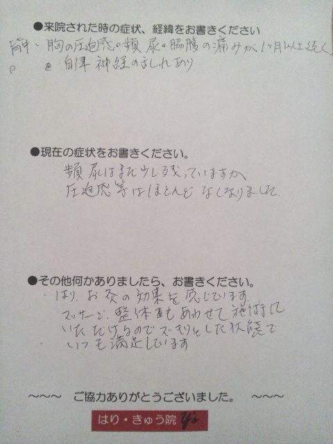 週1回~2週に1回ぐらいの間隔で治療を受けられ、約8回ぐらいで背中と胸の痛みと圧迫感、肩から腕にかけての脱力感は症状が改善され、患者様は今はこの症状がほとんどなくなったとおしゃっていました。