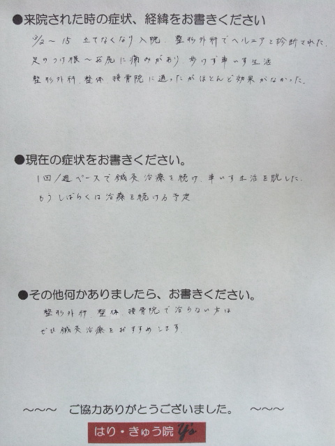 鍼灸治療を週1回きちんと受けて頂いたこと、痛みがありながらも体を動かして頂いたことで、徐々にではありましたが確実に痛みの改善に繋がり、その結果、車椅子を使わずに立ったり歩いたりすることができるようになったものと確信しています。